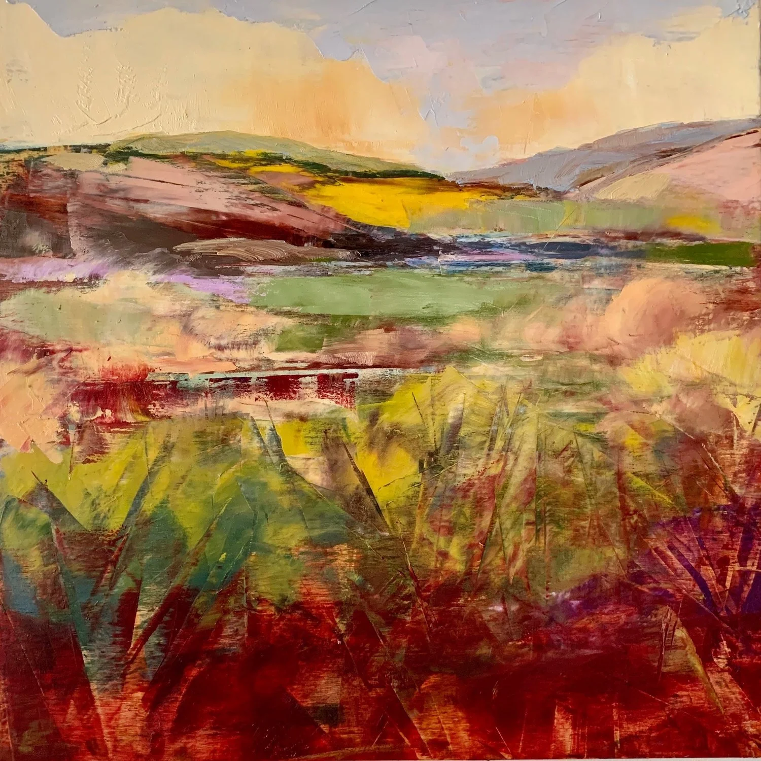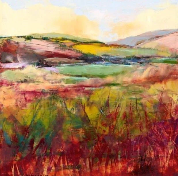 Colors explode in the farm land where I live. This abstract painting zings with excitement of the changing seasons.