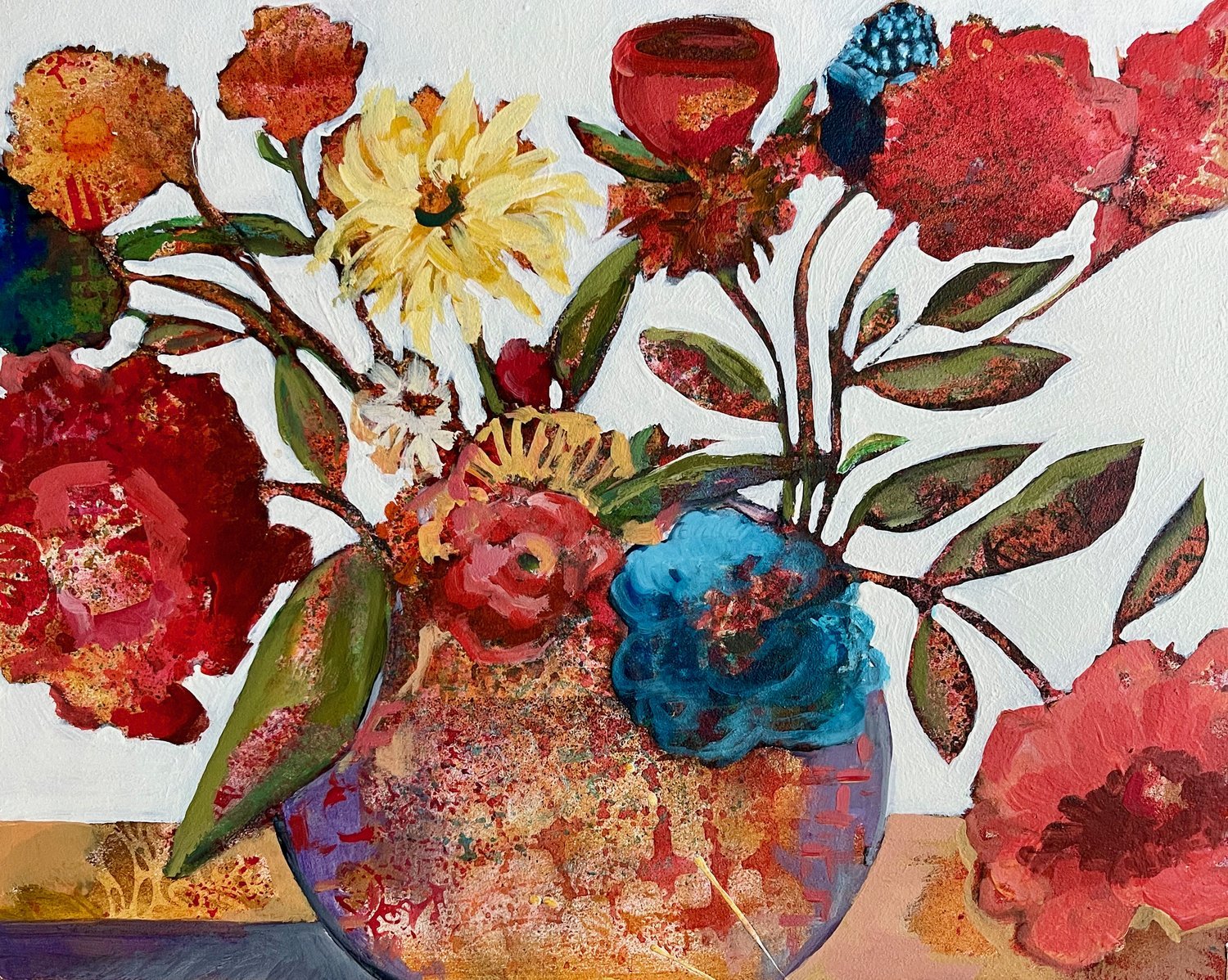 A mixed media creation of garden flowers. Vibrant colors created on a professional wood panel with professional inks, golden acrylics and sealed with an archival varnish.