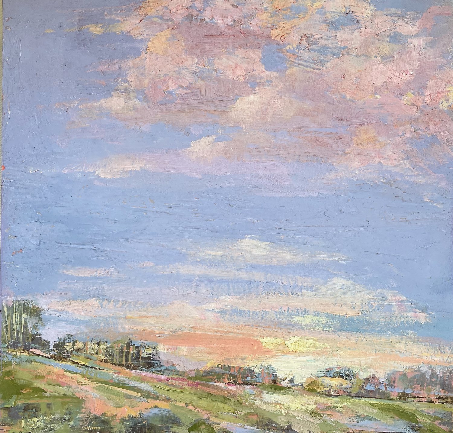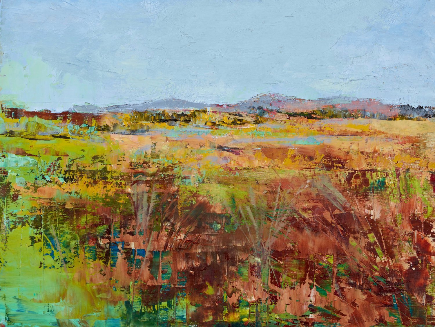 This little landscape was created in a field where you could see far into the horizon. Painted with thick layers of professional oil paint, and cold-wax applied with a palette knife. One of my favorite ways to paint, you never know what kind of magic will happen.