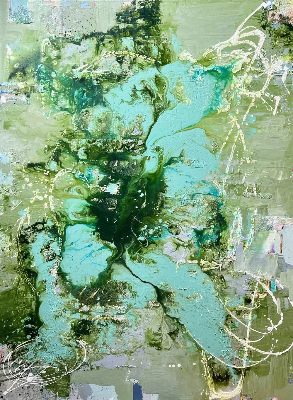 Above looking down from a plane, the green earth, patterns and shapes are spellbinding. This abstract was created with layers upon layers of texture, thick paint, and line. It gives the viewers hours of little discoveries.