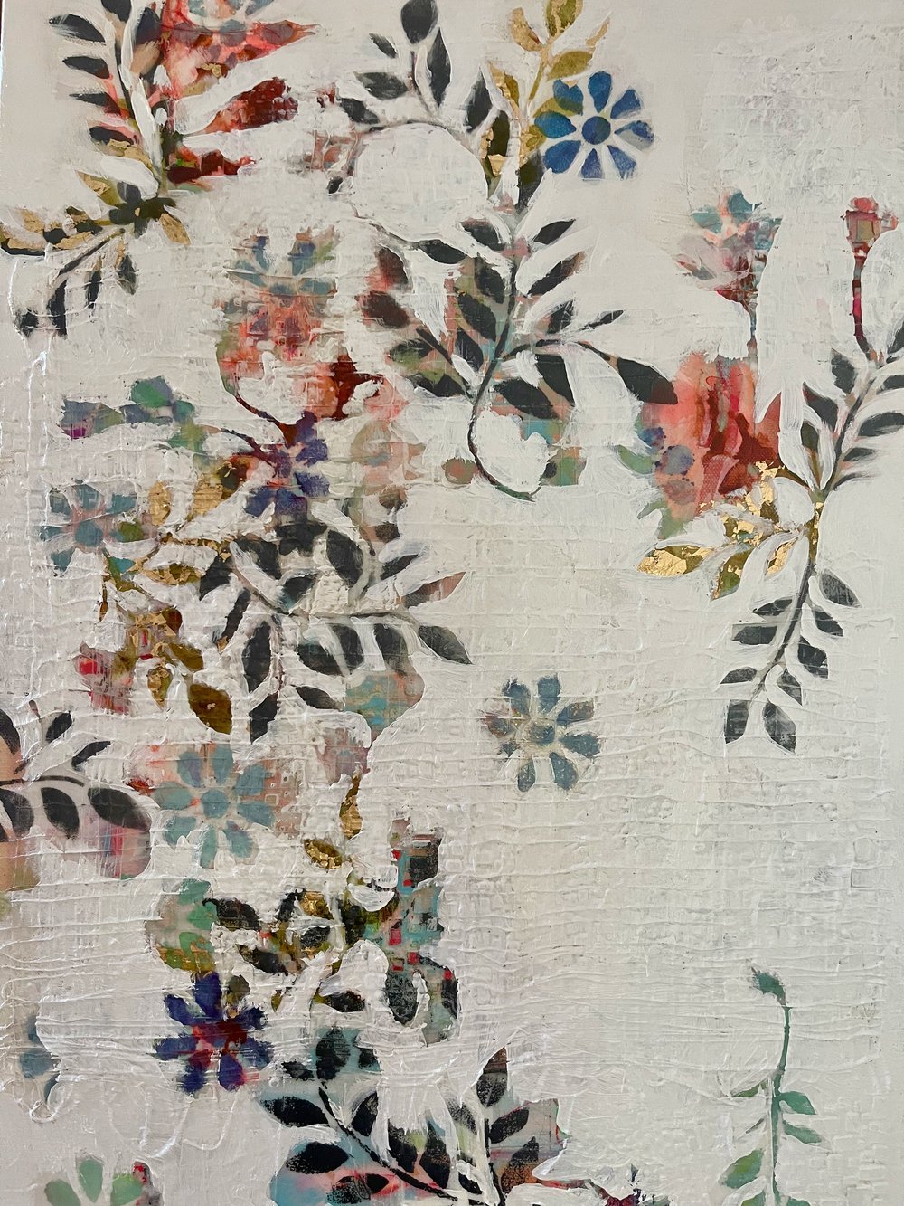 Abstracted flowers created in Spring, my favorite time of year. Nature is waking up and flowers pop up, a feeling I hope this painting conveys. It’s exciting, and serene at the same time.